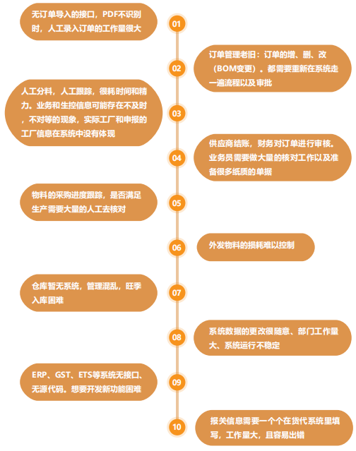 上海意利信息科技股份有限公司迅速成立凯晨项目推进小组,就系统改造做出即刻响应。该项目涉及六大主要核心部门:业务部,生控部,仓储部,单证部,财务部,信息中心;涵盖十大业务流程:开发打样流程,成本报价流程,订单采购流程,物料仓储流程,生产计划流程,生产制造流程,订单成品管控流程,材料报关流程,财务应收应付流程,进口材料核销流程;打造以贸易,生产为主体的全方位,多层次的供应链协同管理系统;以供应链管理系统为主轴,链接WMS仓储系统,车间吊挂系统,移动端APP等,实现客户,供应商,生产,销售的全方位数据共享协同。